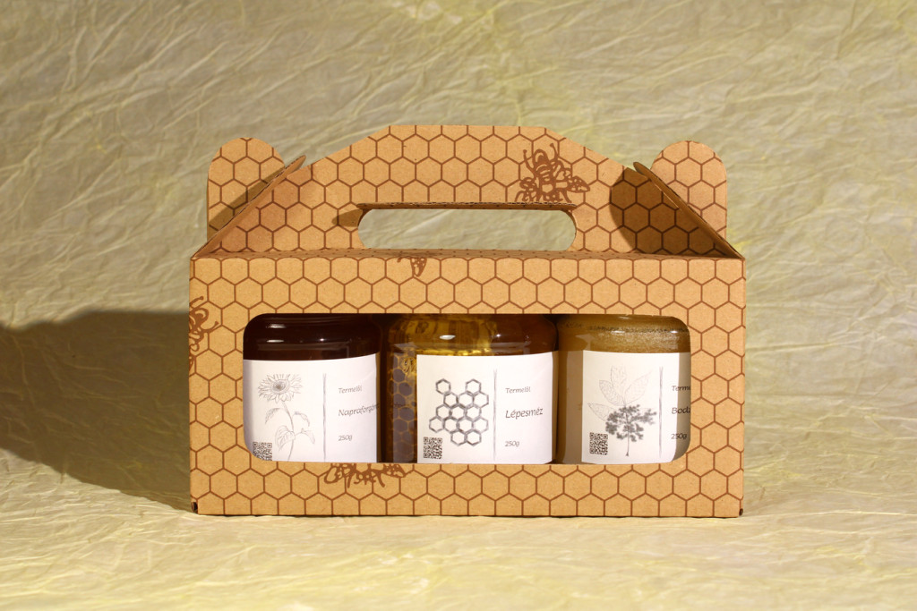 250g lépesméz, 250g napraforgóméz és 250g valamilyen gyógynövénnyel ízesített vagy aranyvesszőméz papír díszdobozban.
