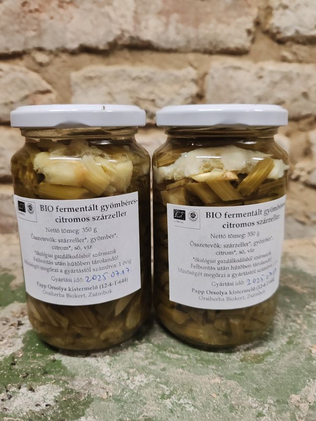 Bio szárzeller fermentálva, egy olyan környezetben, ami igazi ízbombává teszi: a citrom és a gyömbér savanykás-pikáns-fűszeres ízt ad a szárzeller egyedi aromájához! Erős zamata miatt akár egy kiskanállal is elég lehet az ételhez. Összetevők: szárzeller*, citrom*, gyömbér*, só, víz (*ökológiai gazdálkodásból származó összetevő) Megjegyzés: a termék 20 fok alatti helyiségben van tárolva, ezért a fermentálódási folyamata lelassult. Szobahőmérsékletre kerülve a folyamat új lendületet kaphat, ezért kinyitáskor pezsgést tapasztalhatunk. Ez természetes velejárója a fermentálódásnak. Ha túl sok felöntőlé kerülne ki az üvegből, forralt és lehűtött sós vízzel pótolhatjuk. Megjegyzés 2: NEM tartósítjuk hőkezeléssel a fermentált termékeinket, mert akkor elveszítené a lényegét. Emiatt megeshet, hogy a fermentálódás során nem kívánt irányt vesznek a mikrobiológiai folyamatok (a tetőt kissé felnyomják a keletkező gázok és beszöknek más baktériumok, spórák), és kellemetlen szagot, vagy penészréteget találunk. Az ilyen esetet kérjük jelezni!