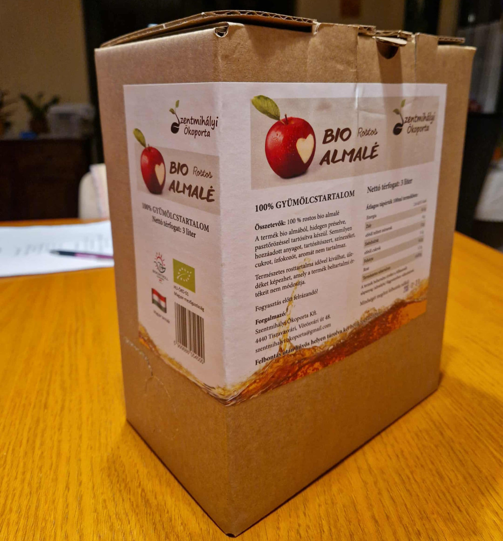 BIO minősítésű Red Jonaprince almából készített szűretlen, natúr 100%-os almalé, 5 literes bag-in-box csomagolásban. Kizárólag kézzel szedett étkezési minőségű almából préseljük. A termék semmilyen hozzáadott anyagot nem tartalmaz, hőkezelt (pasztőrözött). Selymes, aromásan telt ízét a kíméletes préselési technológiának és az étkezési minőségű bio alapanyagnak köszönheti. Felbontás után hűvös helyen tárolandó, és két héten belül ajánlott elfogyasztani. Fogyasztás előtt ajánlott felrázni. A termék bio alapanyagból, Biokontroll által tanúsított gyártóüzemben készült. BIO minősítésű Red Jonaprince almából készített szűretlen, natúr 100%-os almalé, 3 literes bag-in-box csomagolásban. Kizárólag kézzel szedett étkezési minőségű almából préseljük. A termék semmilyen hozzáadott anyagot nem tartalmaz, hőkezelt (pasztőrözött). Selymes, aromásan telt ízét a kíméletes préselési technológiának és az étkezési minőségű bio alapanyagnak köszönheti. Felbontás után hűvös helyen tárolandó, és két héten belül ajánlott elfogyasztani. Fogyasztás előtt ajánlott felrázni. A termék bio alapanyagból, Biokontroll által tanúsított gyártóüzemben készült.