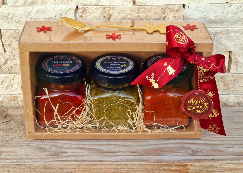 - 1 Zakuszka 120 ml - 1 Bazsalikom pesto 120 ml - 1 Harissza 120 ml - 1 Ünnepi kencekenegető kanálka véletlenszerű színben (arany/ezüst), mintában
