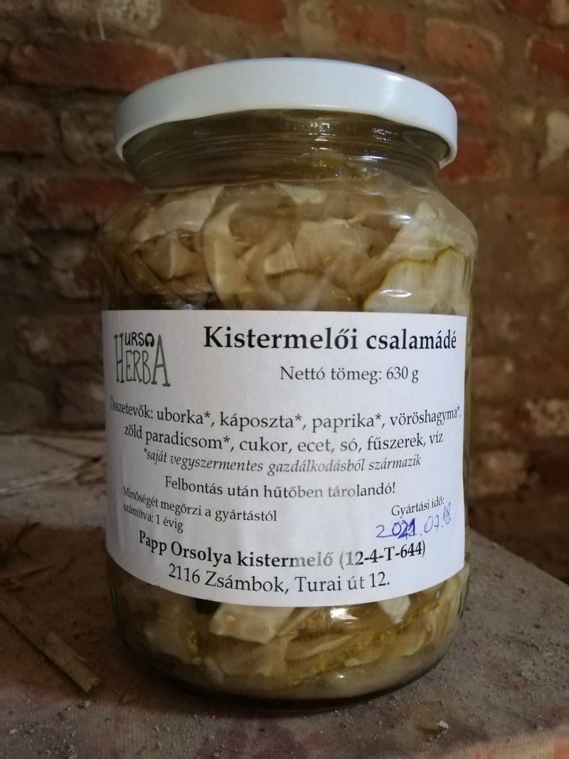 Falusi csalamádé öko alapanyagokból. Összetevők: uborka*, káposzta*, paprika*, zöldparadicsom*, vöröshagyma*, cukor, ecet, fűszerek *saját ökológiai gazdaságból származó összetevő Hőkezeléssel tartósítva.